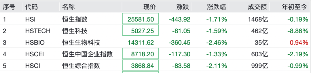 港股市集跌幅显豁,范畴发稿,恒生指数跌1.71%,恒生科技指数跌1.59%,恒生生物科技指数跌2.46%。个股方面,腾讯控股跌超6%,快手跌超5%,哔哩哔哩跌超4%,阿里巴巴跌超3%。