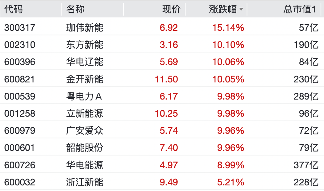 东方新能、华电辽能、金开新能、粤电力A、立新动力、广安爱众、韶能股份纷纷涨停。珈伟新能涨超15%,华电动力涨近9%,长江电力、华电新能、中国广核、华能水电等飘红。