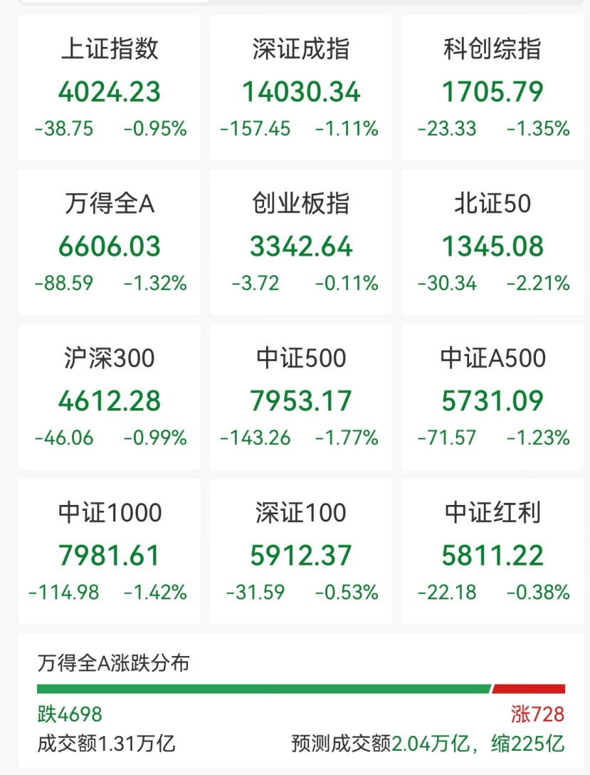 范畴午间收盘,沪指跌0.95%,深证成指跌1.11%,创业板指跌0.11%,科创综指跌1.35%。